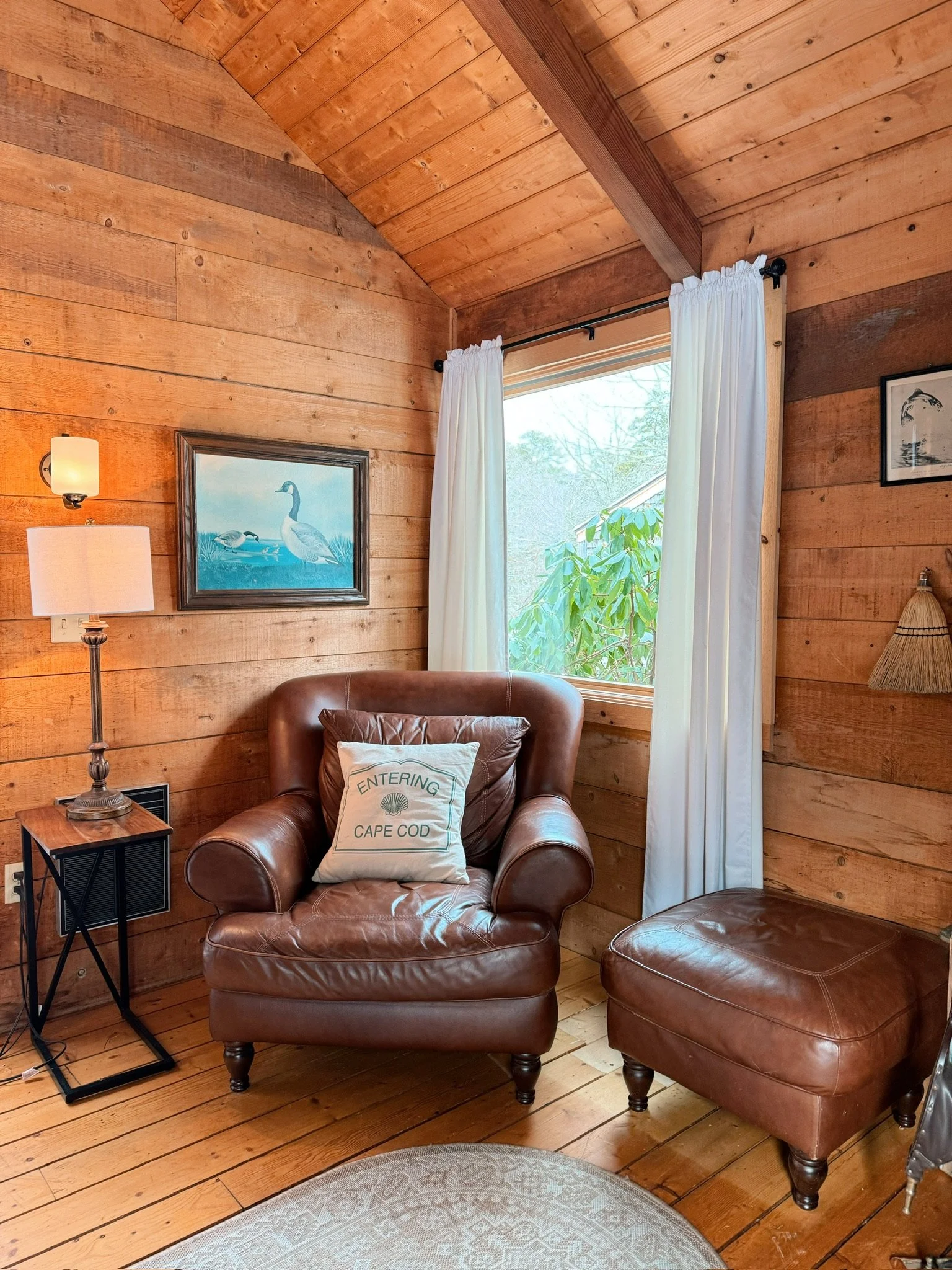 Cozy living room with wood-paneled walls and ceiling, leather sofa with cushion, window with white curtain, fireplace with nautical decor, flat-screen TV, and a beige oval rug.